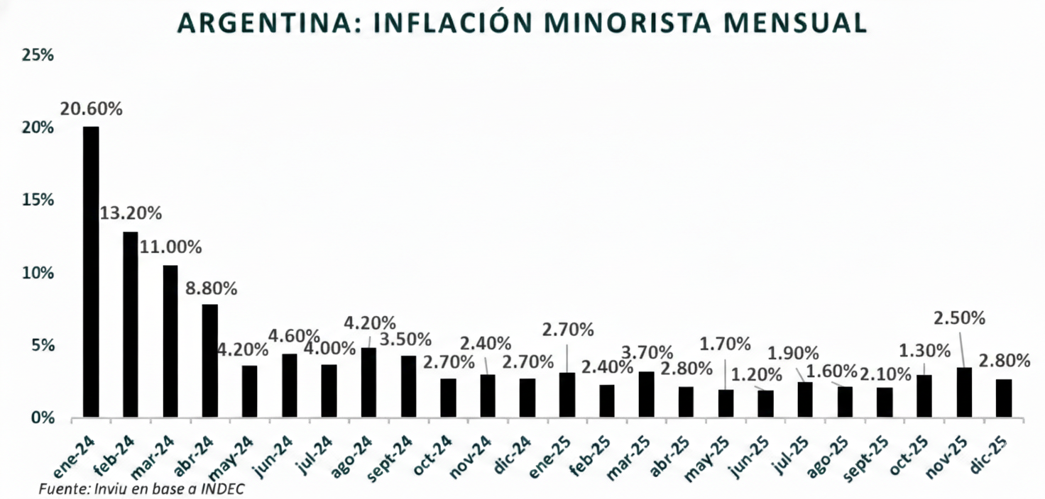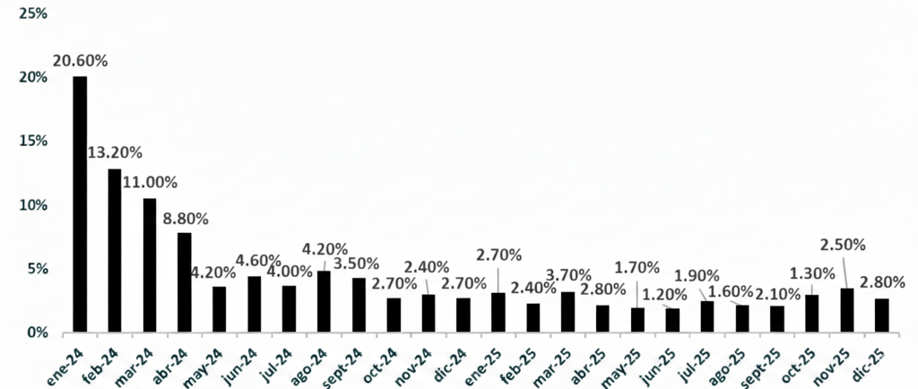 Más allá del dato de diciembre, el mercado sigue viendo este movimiento como transitorio. Las expectativas para el primer trimestre apuntan a una desaceleración gradual, con inflación en torno al 2% mensual en enero y febrero, y un leve rebote estacional en marzo, habitual antes de un segundo trimestre más benigno.